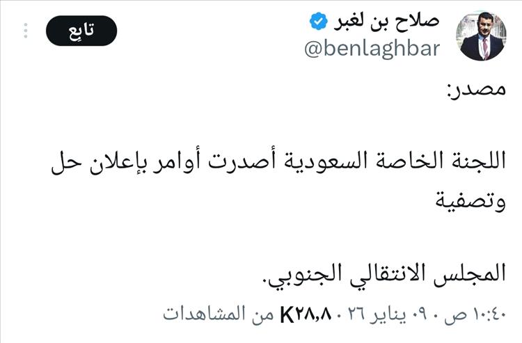 ونقلاً عن مصادر وصفها بالموثوقة، أفاد بن لغبر أن اللجنة الخاصة السعودية أصدرت أوامر وتوجيهات تقضي بالبدء في إجراءات حل وتصفية المجلس الانتقالي الجنوبي.