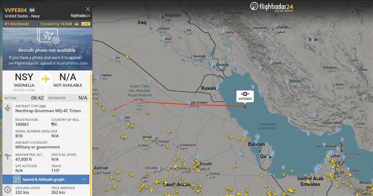 أظهرت بيانات موقع "فلايت رادار" المتخصص في تتبع حركة الطيران، تحليق طائرة مسيّرة من طراز Northrop Grumman MQ-4C Triton تابعة للبحرية الأمريكية في الأجواء الدولية فوق مياه الخليج. وأشارت البيانات إلى أن الطائرة تنفذ مهامها حالياً على ارتفاع شاهق يصل إلى 47 ألف قدم. تُصنف "تراتون" (Triton) كواحدة من أحدث الطائرات المسيّرة التي تعمل بنظام الارتفاع العالي والتحمل الطويل (HALE). صُممت هذه الطائرة خصيصاً لتوفير تغطية شاملة للمحيطات والمناطق الساحلية، حيث تمتلك القدرة على البقاء في الجو لأكثر من 24 ساعة متواصلة في المهمة الواحدة.