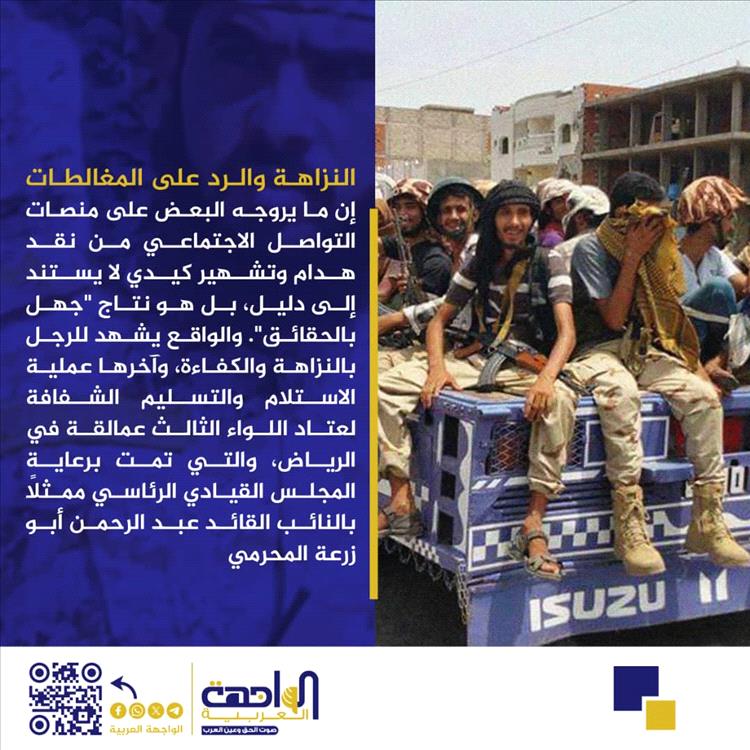 والواقع يشهد للرجل بالنزاهة والكفاءة، وآخرها عملية الاستلام والتسليم الشفافة لعتاد اللواء الثالث عمالقة في الرياض، والتي تمت برعاية المجلس القيادي الرئاسي ممثلاً بالنائب القائد عبد الرحمن أبو زرعة المحرمي.