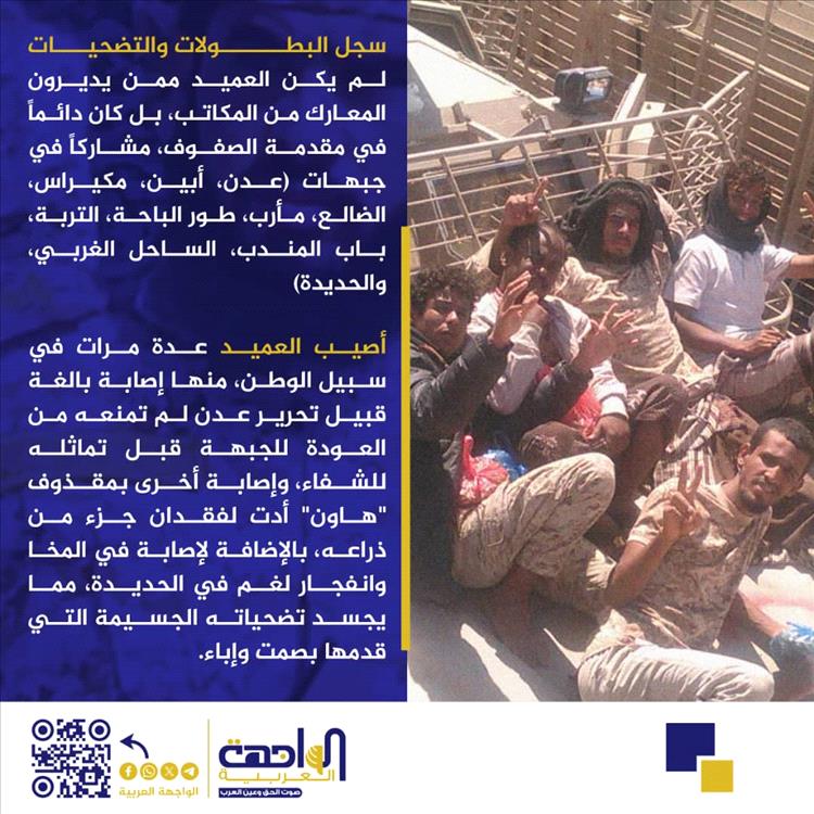 لم يكن العميد ممن يديرون المعارك من المكاتب، بل كان دائماً في مقدمة الصفوف، مشاركاً في جبهات (عدن، أبين، مكيراس، الضالع، مأرب، طور الباحة، التربة، باب المندب، الساحل الغربي، والحديدة).
