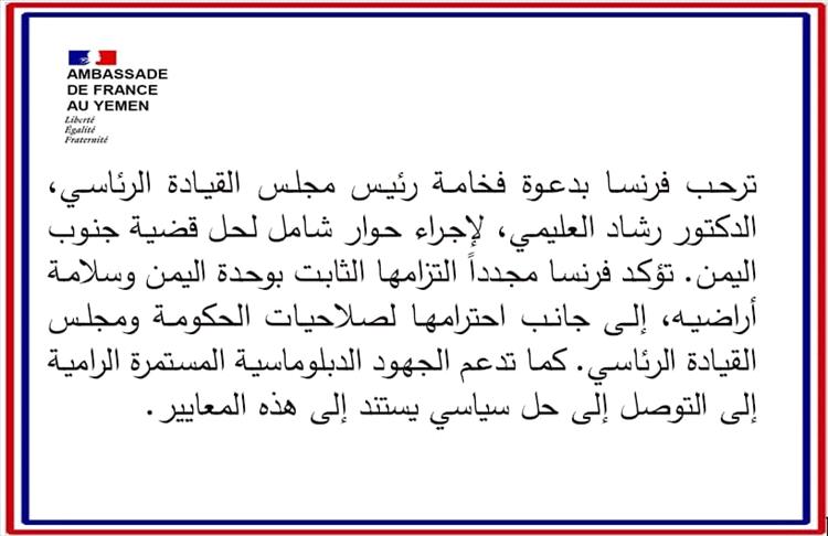 وفي بيان نشرته السفارة الفرنسية لدى اليمن، أشادت باريس بمبادرة الرئيس العليمي، معتبرة أن الحوار الشامل هو الطريق الأمثل للتوصل إلى تسوية عادلة ومستدامة للقضية الجنوبية ضمن إطار الدولة.
