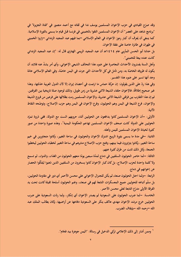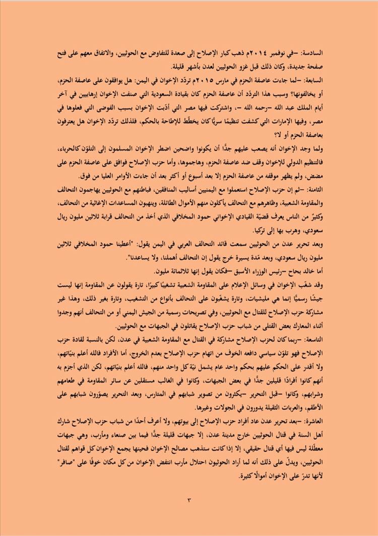 واعتبر الكاتب أن هذا التحالف التاريخي انعكس مباشرة على الساحة اليمنية من خلال "التخادم" بين حزب الإصلاح وجماعة الحوثي، بهدف زعزعة أمن المجتمعات الإسلامية بإشراف مخابراتي دولي، حسب وصفه.