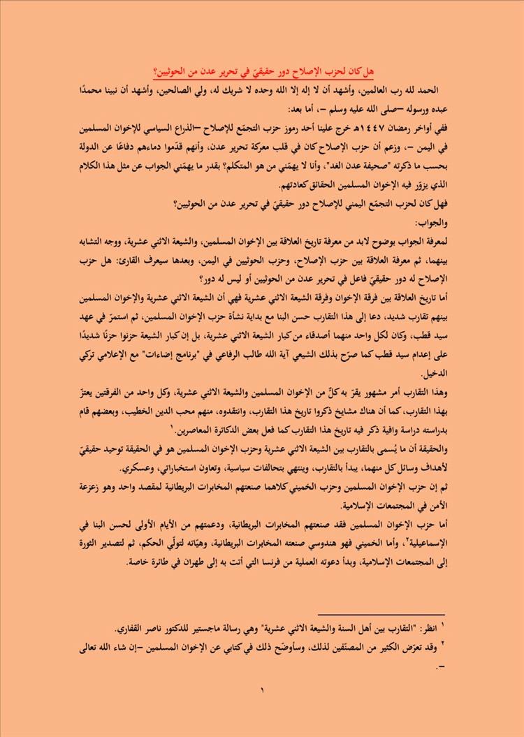 أصدر الشيخ السلفي علي الحذيفي العدني مقالاً جديداً فند فيه التصريحات الأخيرة لبعض رموز حزب التجمع اليمني للإصلاح (الذراع السياسي للإخوان المسلمين في اليمن)، والتي ادعت وجود دور محوري للحزب في معركة تحرير العاصمة المؤقتة عدن عام 2015.