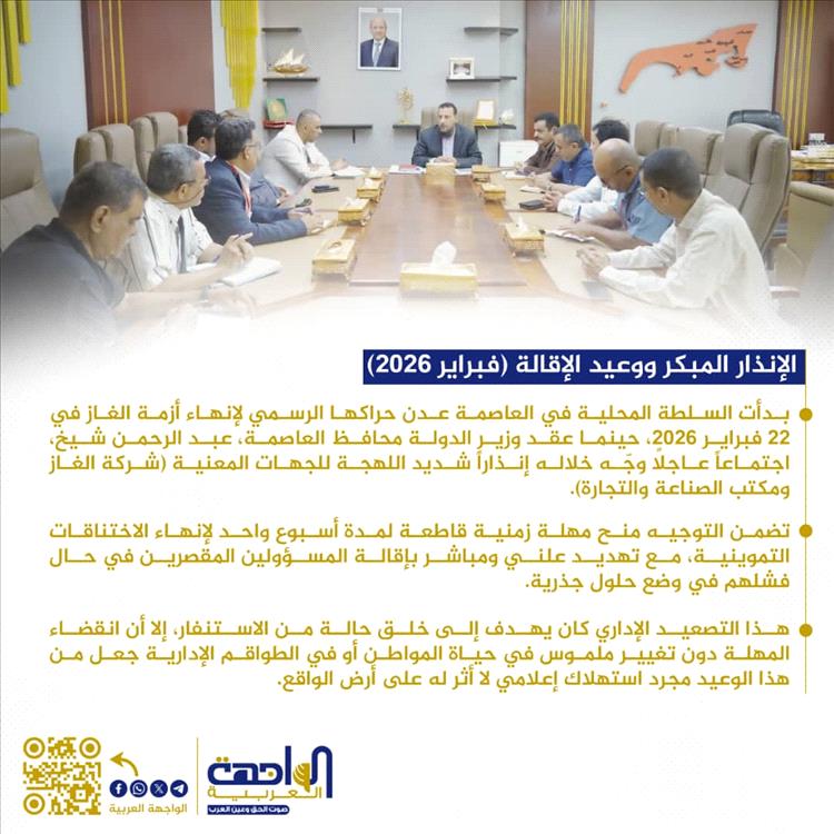 بدأت السلطة المحلية في العاصمة عدن حراكها الرسمي لإنهاء أزمة الغاز في 22 فبراير 2026، حينما عقد وزير الدولة محافظ العاصمة، عبد الرحمن شيخ، اجتماعاً عاجلاً وجّه خلاله إنذاراً شديد اللهجة للجهات المعنية (شركة الغاز ومكتب الصناعة والتجارة). تضمن التوجيه منح مهلة زمنية قاطعة لمدة أسبوع واحد لإنهاء الاختناقات التموينية، مع تهديد علني ومباشر بإقالة المسؤولين المقصرين في حال فشلهم في وضع حلول جذرية. هذا التصعيد الإداري كان يهدف إلى خلق حالة من الاستنفار، إلا أن انقضاء المهلة دون تغيير ملموس في حياة المواطن أو في الطواقم الإدارية جعل من هذا الوعيد مجرد استهلاك إعلامي لا أثر له على أرض الواقع.