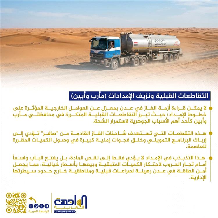 لا يمكن قراءة أزمة الغاز في عدن بمعزل عن العوامل الخارجية المؤثرة على خطوط الإمداد؛ حيث تبرز التقاطعات القبلية المتكررة في محافظتي مأرب وأبين كأحد أهم الأسباب الجوهرية لاستمرار الشحة. هذه التقطعات التي تستهدف شاحنات الغاز القادمة من "صافر" تؤدي إلى إرباك البرنامج التمويني وخلق فجوات زمنية كبيرة في وصول الكميات المقررة للعاصمة. هذا التذبذب في الإمداد لا يؤدي فقط إلى نقص المادة، بل يفتح الباب واسعاً أمام تجار الحروب لاحتكار الكميات المتبقية وبيعها بأسعار خيالية، مما يجعل أمن الطاقة في عدن رهينة لصراعات قبلية ومناطقية خارج حدود سيطرتها الإدارية.