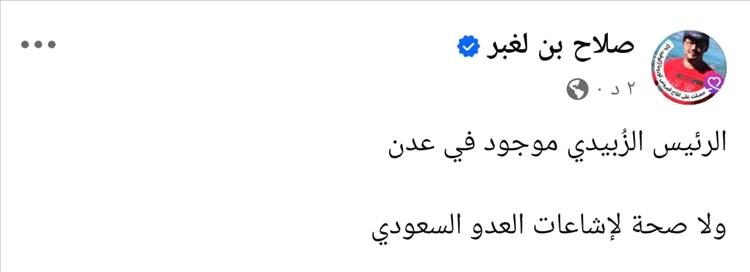 ونفى بن لغبر بشكل قاطع الأنباء التي تحدثت عن مغادرة الرئيس أو عدم تواجده، واصفاً تلك المعلومات بـ "إشاعات العدو السعودي" التي تستهدف الجبهة الداخلية، مؤكداً بصريح العبارة: "الرئيس الزُبيدي موجود في عدن، ولا صحة لما يتم تداوله".