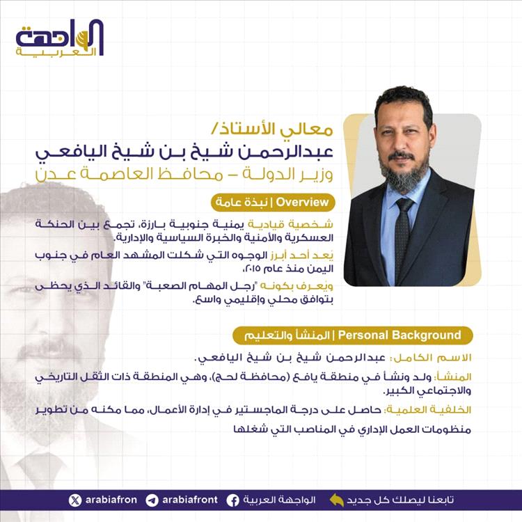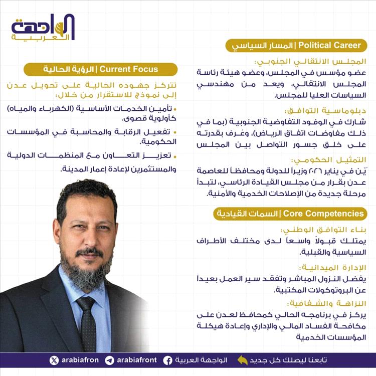 • التمثيل الحكومي: عُيّن في يناير 2026 وزيراً للدولة ومحافظاً للعاصمة عدن بقرار من مجلس القيادة الرئاسي، لتبدأ مرحلة جديدة من الإصلاحات الخدمية والأمنية.