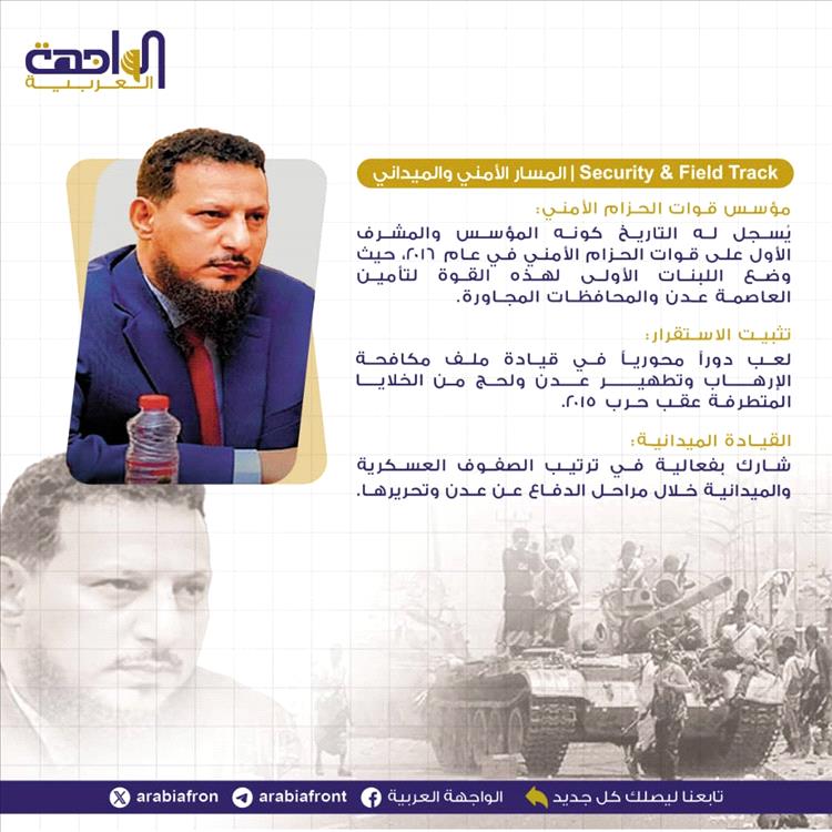 • تثبيت الاستقرار: لعب دوراً محورياً في قيادة ملف مكافحة الإرهاب وتطهير عدن ولحج من الخلايا المتطرفة عقب حرب 2015.